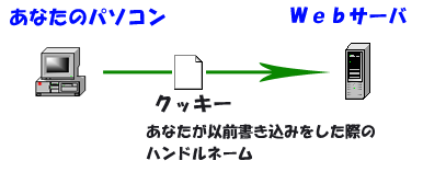 これらの情報を受け取ったWEBサーバはあなたのパソコンに対して、あなたのハンドルネームが書かれたクッキーと呼ばれる情報を送り返します。そして、クッキーを受け取ったあなたのパソコンは、しばらくの間あなたのパソコン内にクッキーを保存しておきます(図2)。
