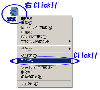 まず、できあがったHTMLファイルを右クリックし、メニューの中の「コピー」をクリックします(下図参照)。